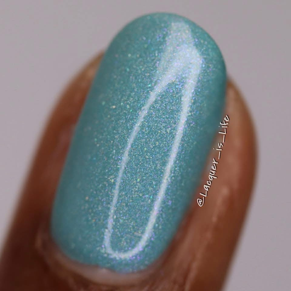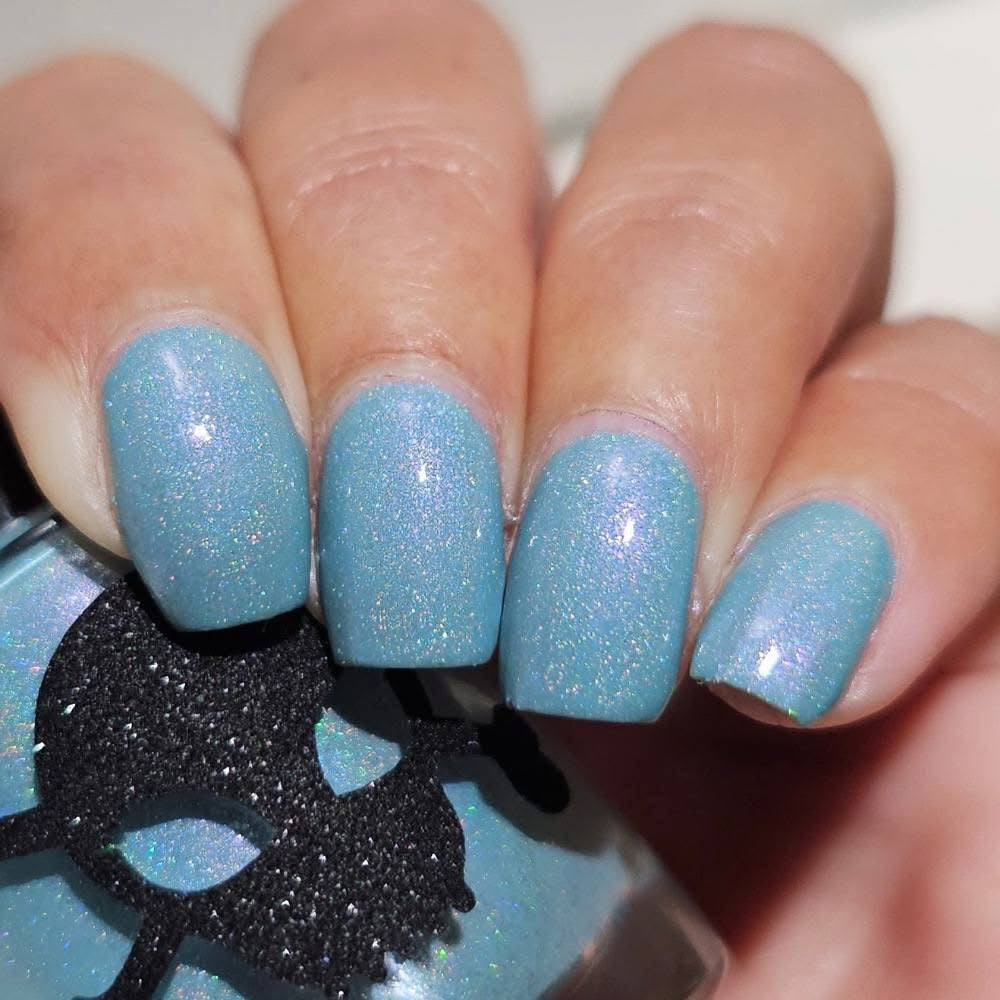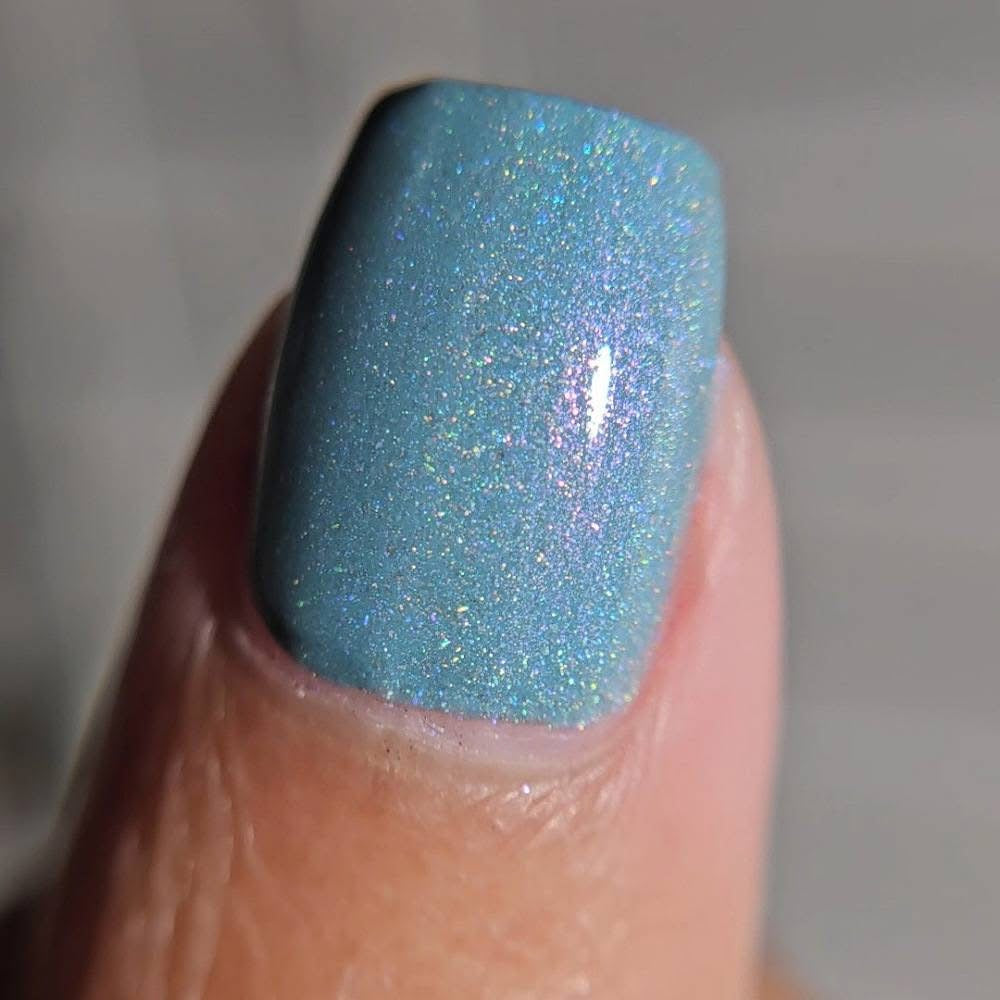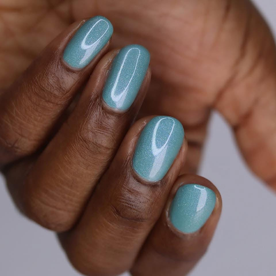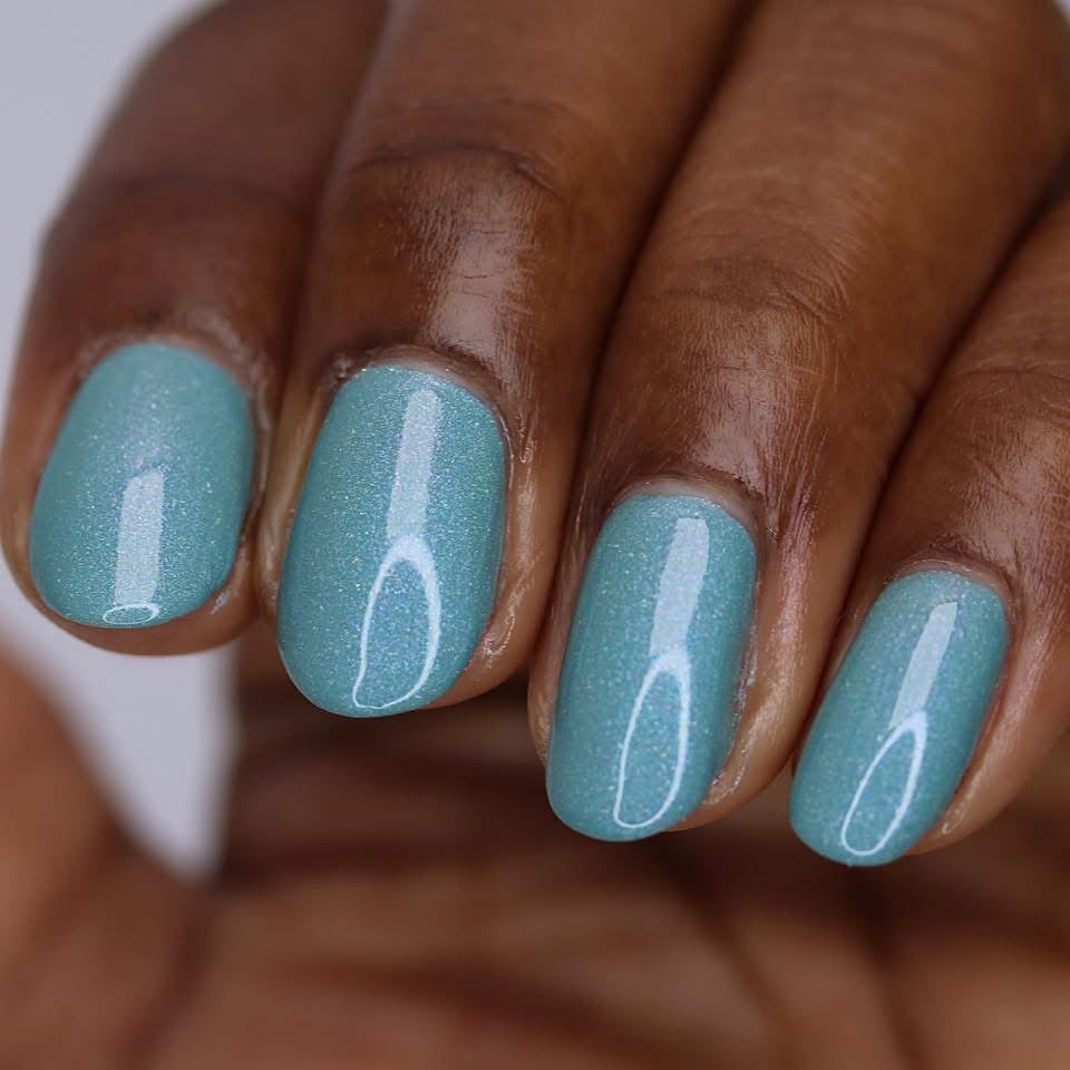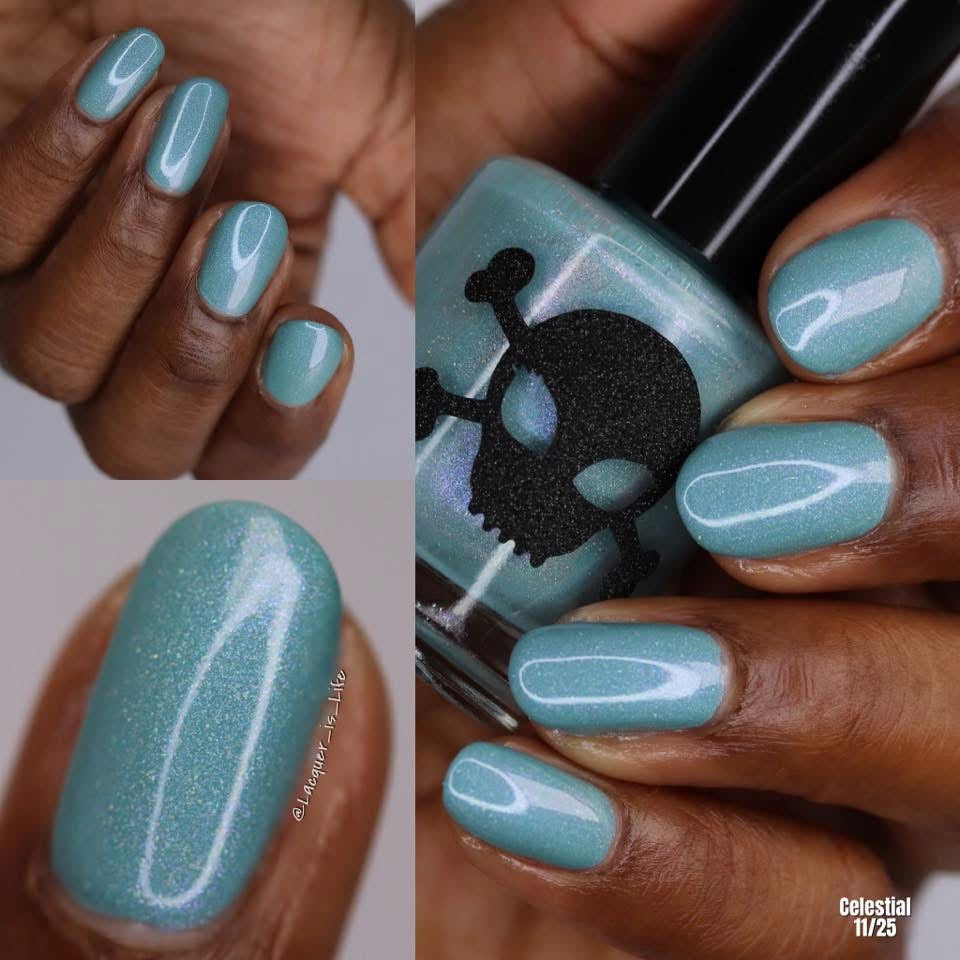 Celestial is inspired by my love for twilight and the chill of the seasonal weather. Cyan is a light blue crelly with scattered holo and holo glitters with a touch of pink and purple shimmer.
